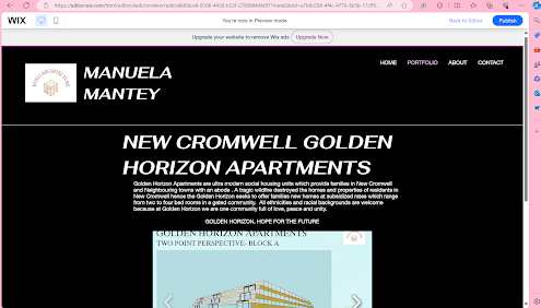 Up next was the main objective of the website update which is to upload my portfolio. I did this by creating a page for the Golden Horizon project which links to the portfolio page with a button. Afterwards I used the same method which has been constant throughout which is uploading the required images. I did not do it in any random order but I grouped the respective aspects of my portfolio. The boards with text, 3d physical and digital designs, the technical aspect and one 3d digital work followed by the reference page to close it off.